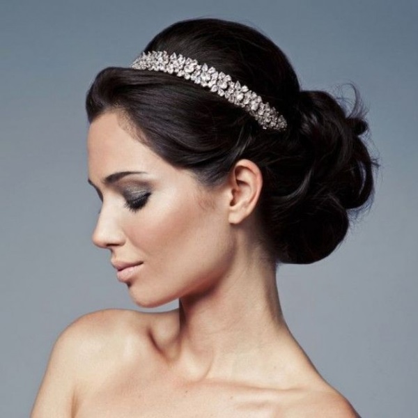 تسريحة شعر مرفوعه موديل الكعكه مع اكسسوار جميل يزين الشعر ممتازة للعروس ذات شكل الوجه البيضاوي ليبرز منحنيات الوجه وتناسب فساتين زفاف بدون حمالات او بحمالات على الرقبة